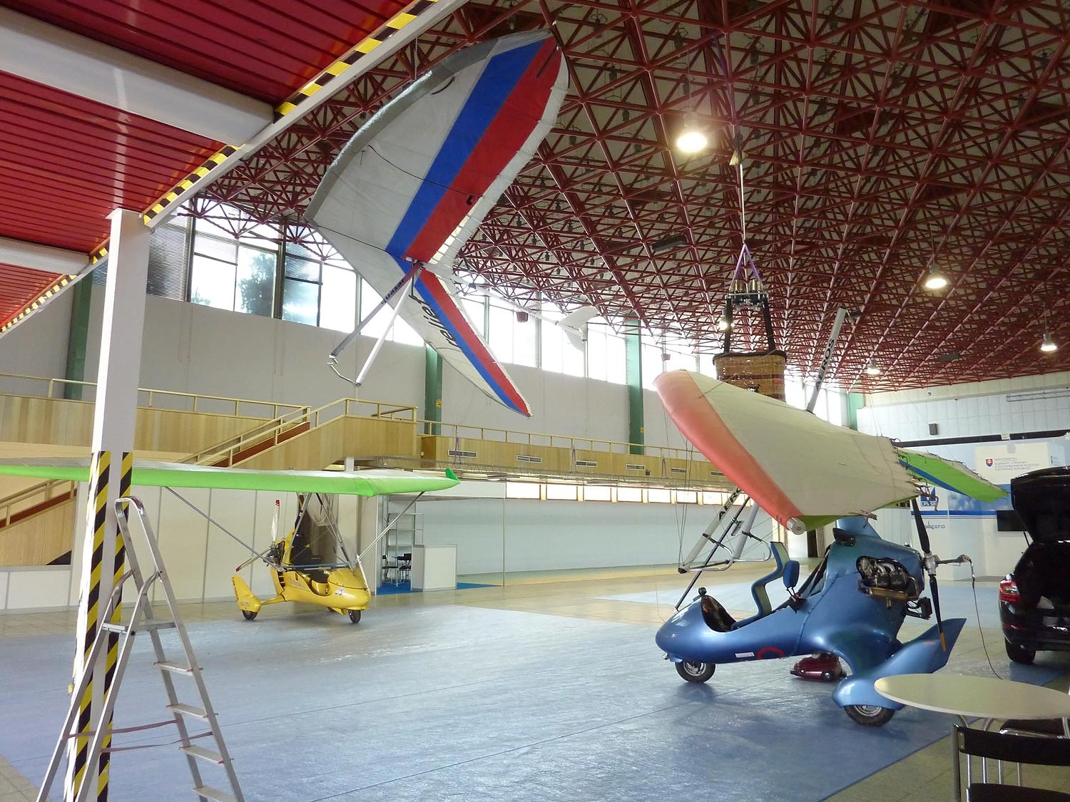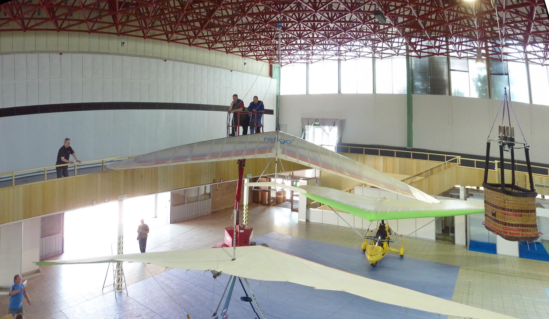 Po chvíli přijíždí pracovníci výstaviště a s profesionální jistotou zavěšují bezmotorové rogalo ke stropu.