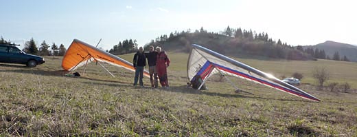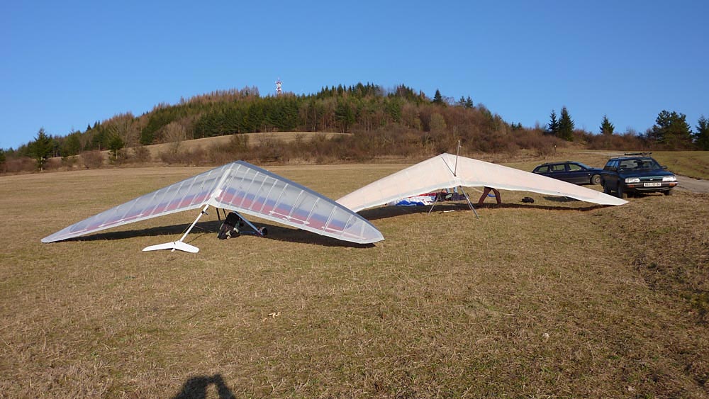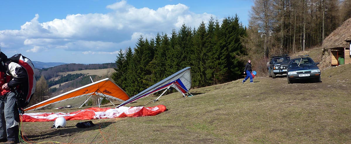 Dnes ráno vypadá předpověď i počasí naprosto skvěle. Pokouším se kontaktovat snad všechny “aktivní” létače, ale nakonec mi volá pouze David. Za dvě hodiny už pádíme s křídly na autě na Straník.