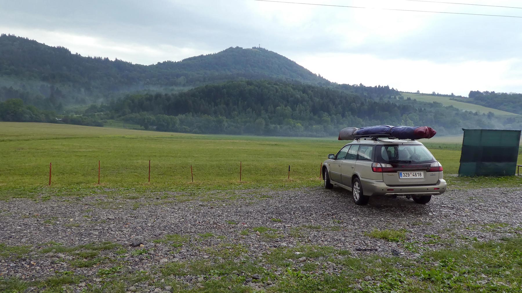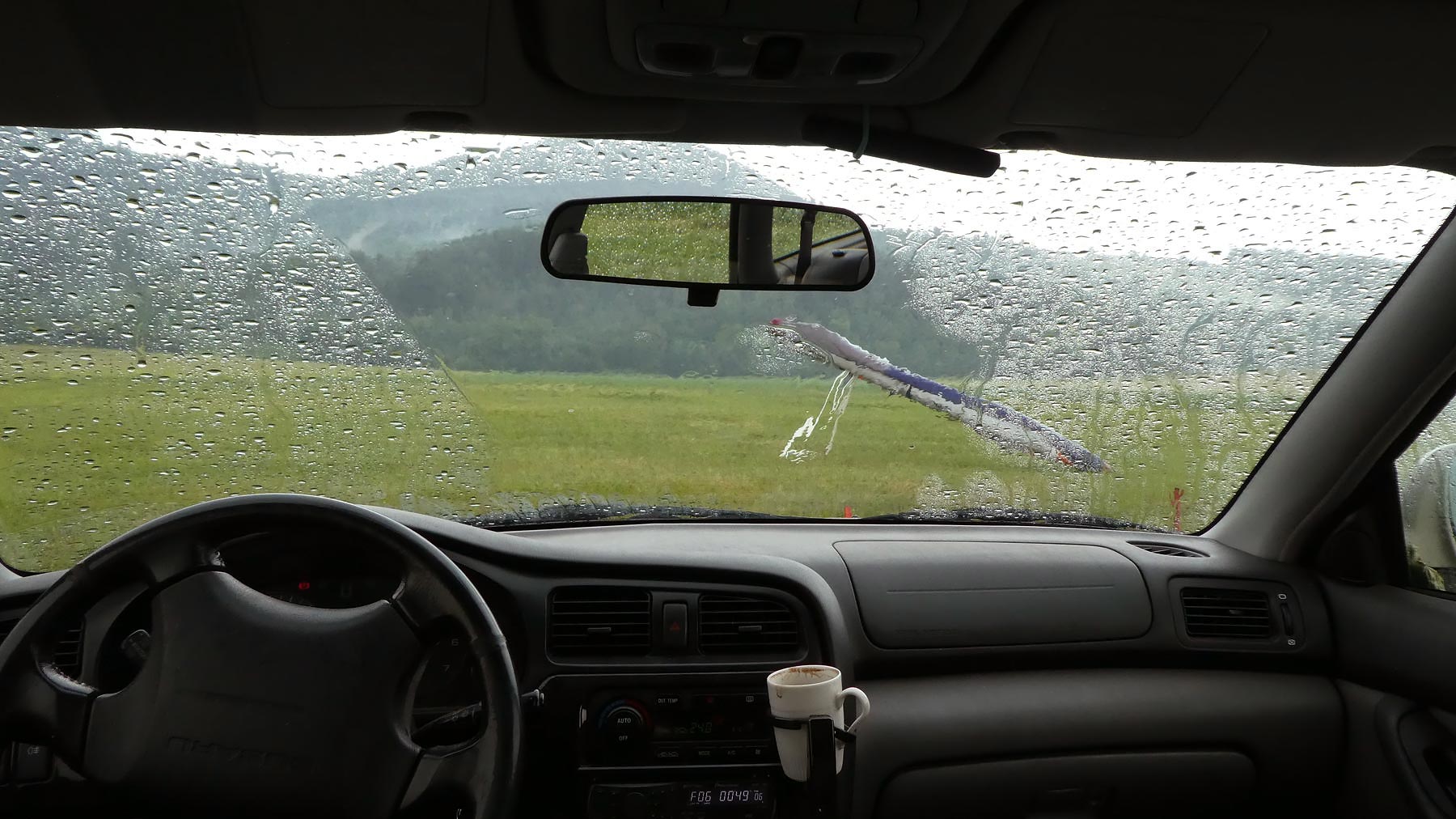 Z tmavé oblohy již mírně kape a když nastupuji nahoře do auta, začíná “slejvák”. Dole pak u ne úplně sbaleného křídla čekám v autě asi 20 minut až přestane pršet.