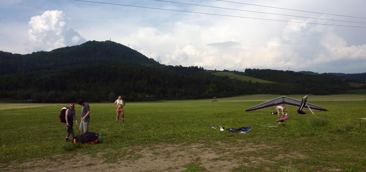 Na kopci je trochu chladněji a dokonce tu mimo padáčkářů potkávám Martina a Zdeňka s rogaly. Rychle stavím křídlo a startuji po 14. hodině. Termika je evidentně zatlumená, zřejmě výrazným vývojem v jiných místech a není jednoduché nejen stoupat, ale i udržet výšku. Let opět snímám kamerou a vzniká následující video: