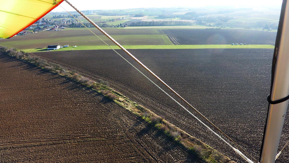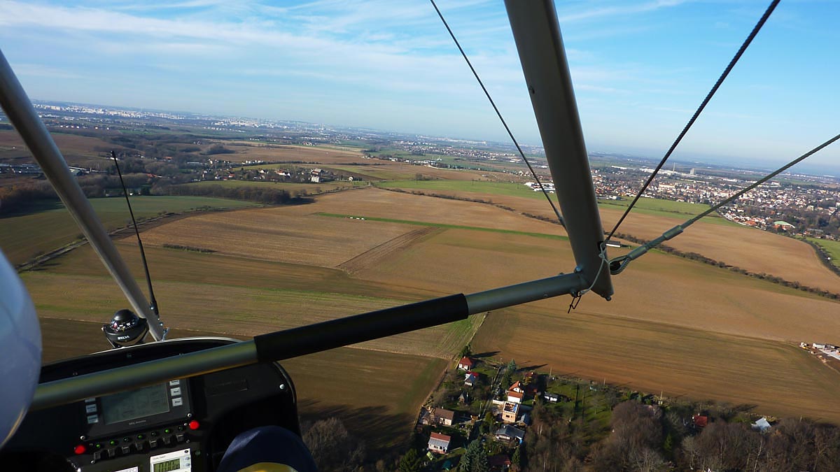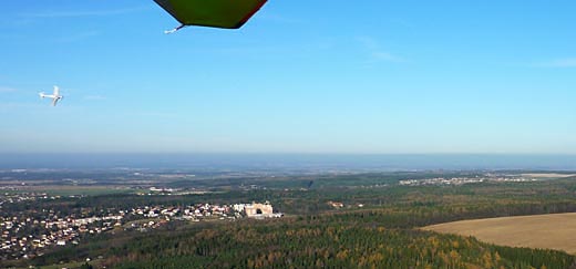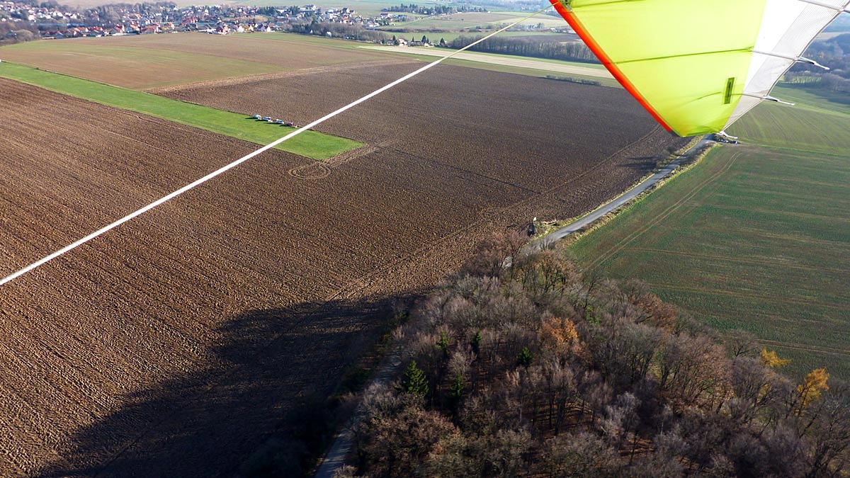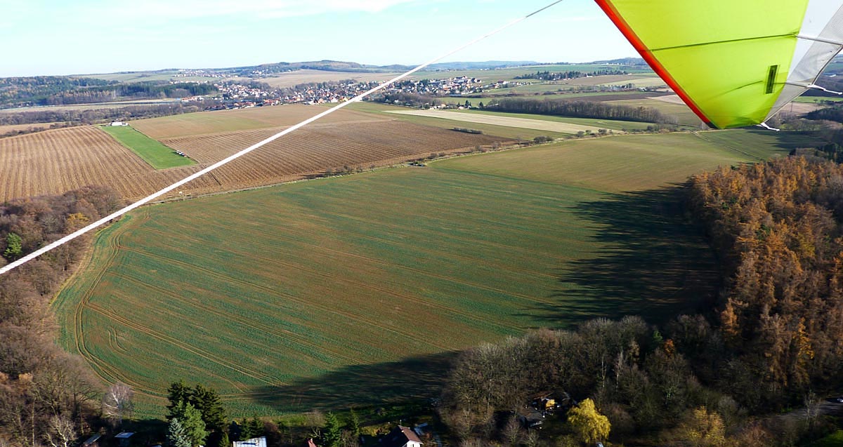 Turbulence nám mírně ztěžuje přibližování k rogalu z kterého nás fotí.