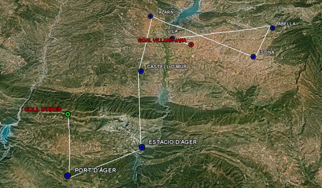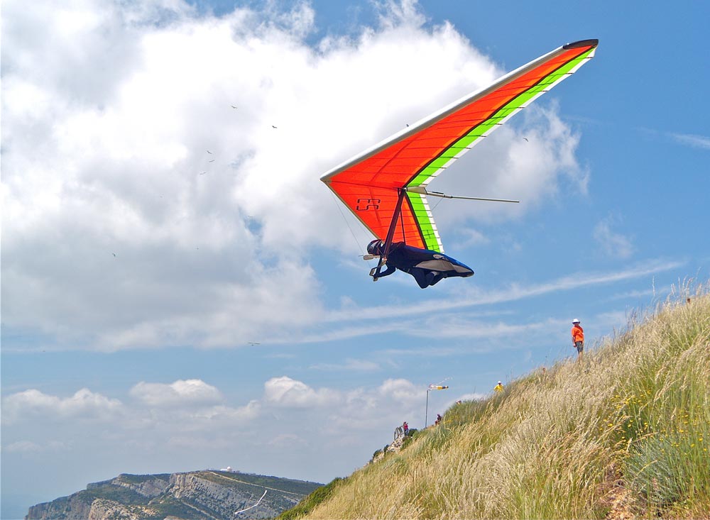 Nazdar Karle, letošní ME se koná ve Španělském Ageru. Z Česka jsme vyjeli až ve čtvrtek večer a na trénink nám zbylo jen jeden a půl dne. Já to znám ještě z MS v roce 1995, když jsem zde létal a Tomáš Suchánek vyhrál potřetí titul. Nádvora a Čejen zde byli loni na préčku, a tak poprvé zde létali jen Pedro, Tůčo a Čapunda. Proto jsme se v sobotu na kopci dohodli vyzkoušet co možná nejvzdálenější OB číslo 43, ležící 70 km na SZ od startu a zpátky 76 km do nejpoužívanějšího cíle v Trempu. Posledních 20 km před otočňákem jsme si vyzkoušeli svahování na krásném hřebeni se stovkami supů a zpátky to chtělo letět rychleji. Nakonec do cíle jsem doletěl jen já většina naší výpravy posedala kolem 40 km od startu o dvě údolí západněji. Kupodivu svoz byl extrémě těžký a Božka je dovezl až v půl druhé ráno. V neděli nás potrénoval jen polovina, protože v 16:30 odpoledne byl povinný bezpečnostní brífink. Vyzkoušeli jsme si jen svah na východ, ale na severu se dělaly bouřky a jižní vítr zesiloval ve 2000 m na 27 km, tak jsme si let moc neužili. V pondělí se letělo první kolo. Nakreslili nám 130 km a na obloze nebyl ani jeden kumulek, zato hodně cirů a jalový jižní vítr. Konečně jsme tam naskákali, ale svah moc nenosil. Parkrát jsem se vrátil ze slabší skupiny a najednou jsem byl na kopci skoro sám, bořil jsem se pod 1560 m vysoký start a klouzal doprava k jezeru, kde už několik ér sedělo. 700 m pod startem jsem se konečně začal zvedat a vydal se na trať přefouknutej přes gate v druhým časem, i když jsem se mohl vrátit o 2 km pro třetí gate o pul hodiny později. Škoda. Po trati se situace výrazně lepšila, povedlo se mi přejíždět jednu skupinu za druhou a nakonec jsem byl v cíli druhej, pár minut před Balážem, který ale měl 3. gate a tak celkově kolo vyhrál. Mě ještě na čas porazil Gerolf, ale 3. po prvním kole je krásný začátek. Bohužell prý měli špatnou GAP formuli a tak v definitivních výsledcích s opraveným GAPEM jsem byl až sedmej. V úterý to bylo zase jalové na startu. Opět svah málo nosil, stále hrozilo, že spadneme na pablby. Dole foukal JV, nad kopcem jih 18 km / hod a ve výšce prý silný západ. Zkrátili včerejší úlohu a kupodivu vedli trať od druhého OB do cíle v Trempu v závětří dominantního startovního hřebene. S Mírou Čápem jsme zase zvorali odchod na trať. Někteří měli až 2800 m, ale naše skupina jen 1600 m a skočili jsme za kopec do silného klesáku. Snad ve 100 m nad prvním políčkem jsme se konečně začli zvedat a relativně po větru jsme letěli k prvnímu optočňáku. Konečně stoupáky zesílily nad 2 m/sec a zvedli jsme se do 2500 m. Zpátky to mělo být proti větru, ale ten se stočil na 25 km/hod západu a tak se mi s Nádvorou dařilo dohánět velké skupiny před námi. Na nečekaném místě jsem našel 5 m/s do 2900 m a pak už to byl prakticky jen trošku napínavý dokluz s pár dotočeními. Do cíle jsem finišoval stovkou a přiletěl jsem tam hned za Čápem asi třicátej. Nakonec z našich doletěli všichni až na Čejena, který mazaně pozdě startoval, bral třetí gate a letěl sám. Zítra má být lepší termika a snad i mraky. Dan Vyhnalík