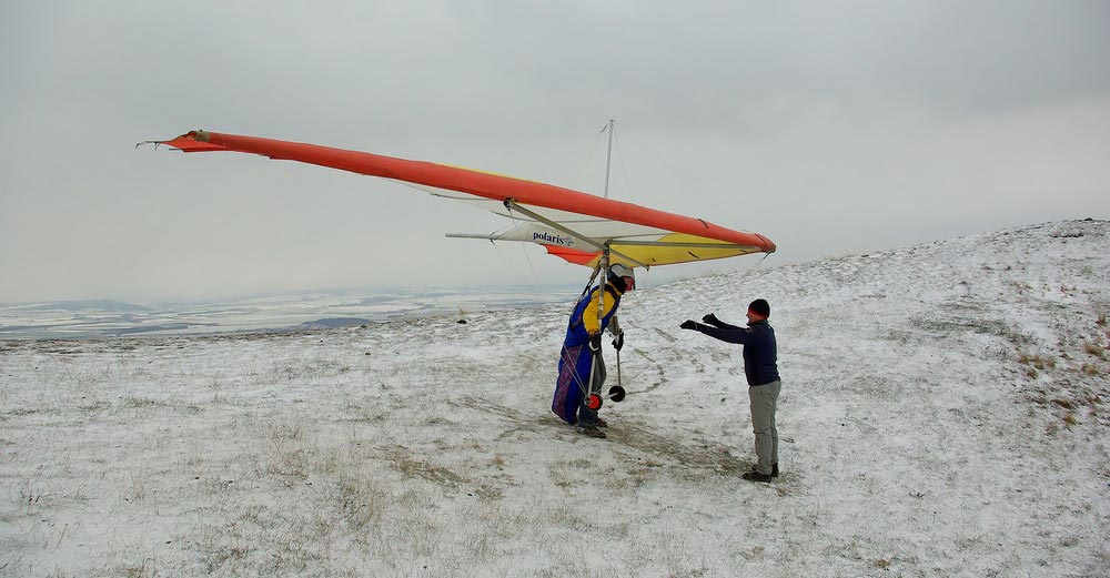 Já ho po chvíli následuji - pár třistašedesátek, rozpočet a už stojím na zemi. Tělo se mi zimou klepe tak, že ani nemůžu povolit karabinu a tak se soukám z připnutého postroje. Hle, někde je chyba, zmrzlé nohy odmítají poslouchat a donesení éra k ostatním ubírá poslední zbytky sil. Vítá mě vysmátý Michal a chrlíme na sebe zážitky. Michal vypravuje, jak při lítání pod sebou sledoval stádo divočáků v lese. To jsou teda věci! Kdysi jsem od jednoho pilota slyšel, že: ”Létaní je jedinečné spojení přírody, člověka a síly okamžiku. A protože jsou všechny tyhle části proměnlivé, pak i létání je pokaždé jiné. Stále nevšedně přitažlivé…” Naprostý souhlas. Nezbývá než poděkovat Martinovi za péči, vytrvalost a trpělivost, se kterou nás dovedl k pilotním zkouškám. Před námi je dlouhá cesta, během které musíme postupně získávat další zkušenosti a návyky, neboť jak se říká: “Starý pilot, dobrý pilot.”