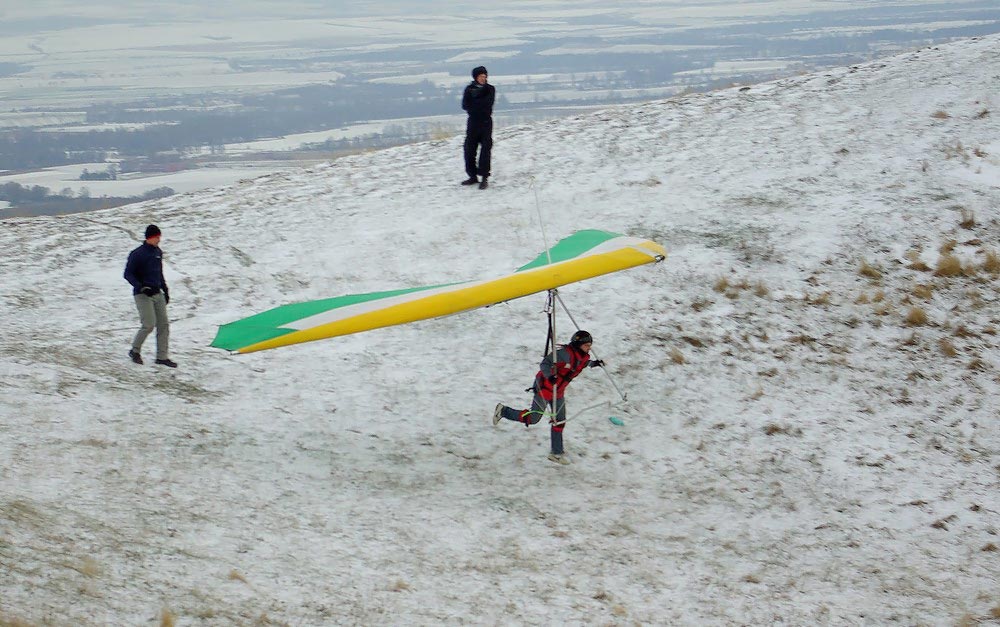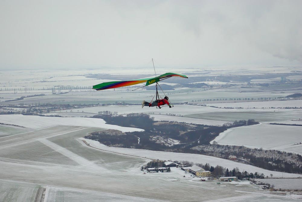 Po první zatáčce už jsem nad hranou a užívám si obratnosti legendárního UP-Cometu a hladkého svahového proudění. Na to, jaký bengál dul na kopci, je to ve vzduchu naprostá pohoda. Vozíme se úplně zadara a tak se s Michalem proháníme vzdušninou, blbneme ve třistašedesátkách a křičíme radostí. Po nějakém čase zjišťuji, že mé městské oblečení (džíny a tenisky) není pro zimní závěsné radovánky nejlepší volbou - jelikož nelítám v buliši, ale v lehačce, mé tělo je ofoukáváno mocným způsobem a tak co chvíli zahřívám ruce, kopu nožičkama, vrtím se a hlavně nehýbu hlavu dolů, protože mi pak studený proud vzduchu fičí přímo za krk-brrrrrr! A k tomu začíná lehce sněžit…