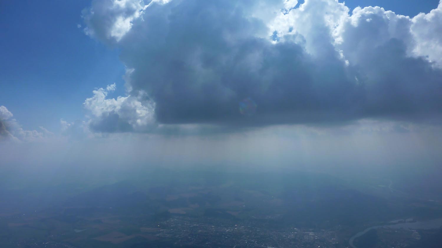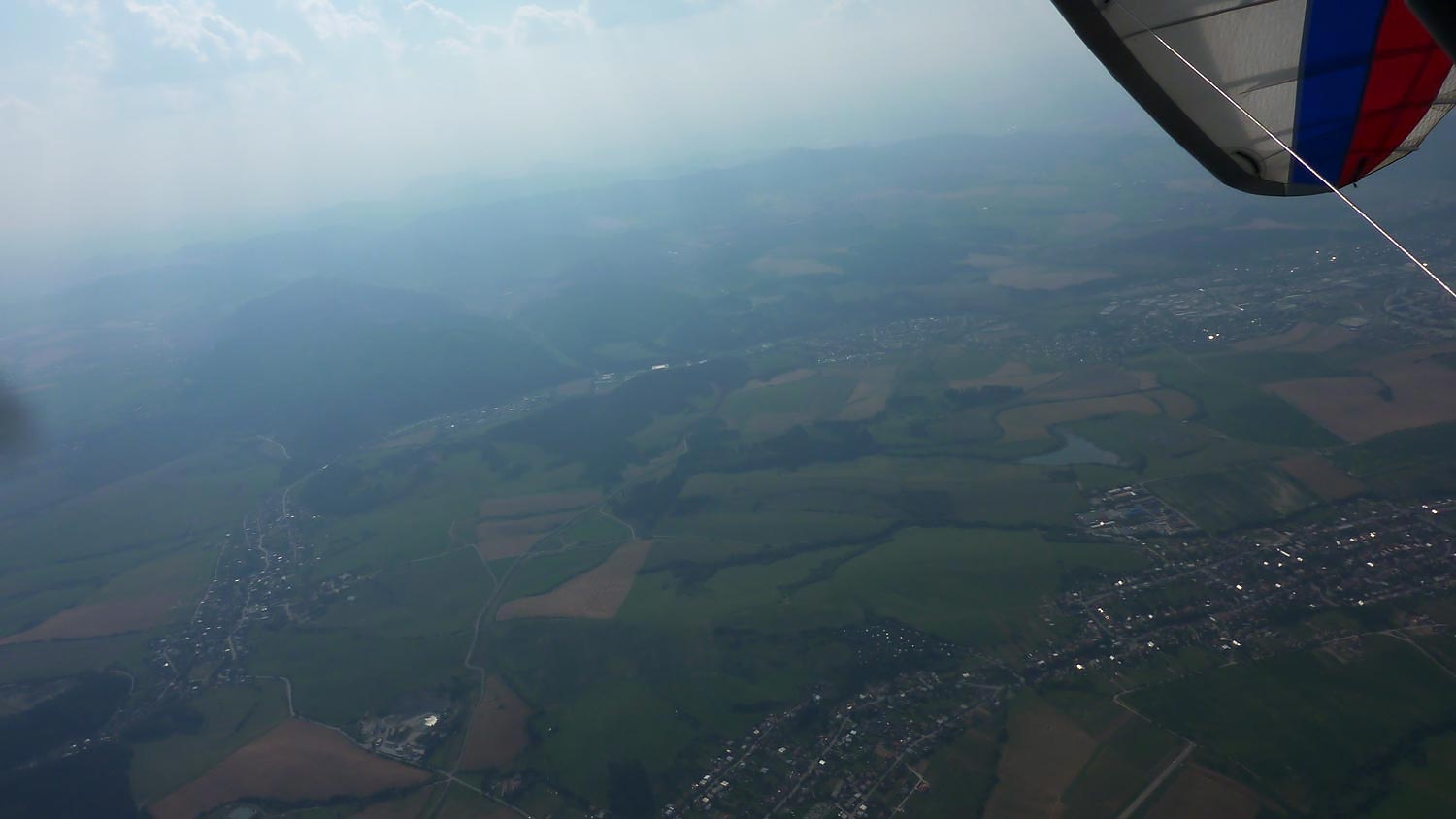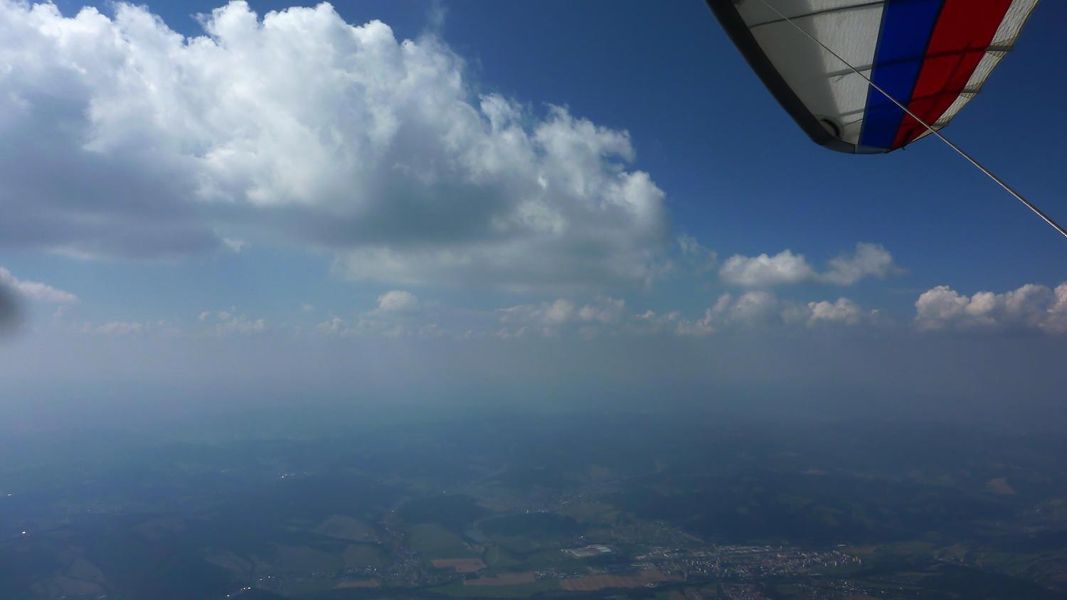Startuji skoro do bezvětří, a chvíli po startu nacházím klidné silné stoupání, které opouštím asi 300 pod základnou a letím se porozhlédnout po okolí.