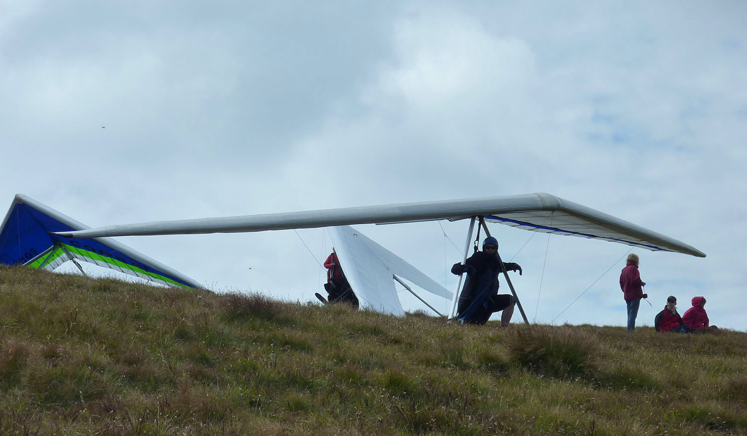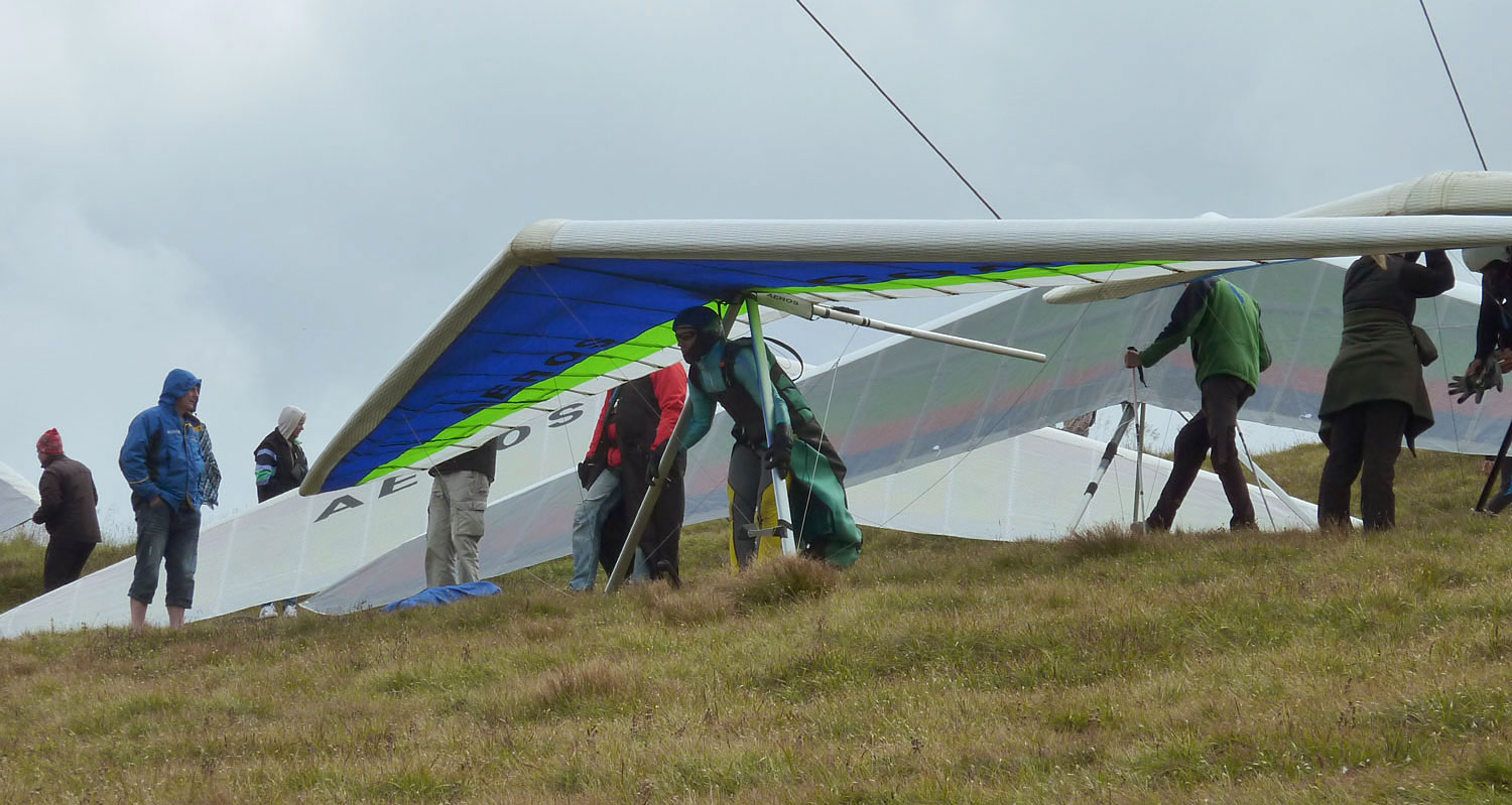 Zpočátku jsme optimisticky začali stavět na jiho-západním startovišti. Snad se to roztrhne a termika vítr přetlačí. Oblačnost se o pár desítek metrů zvedla, občas se v mracích udělala skulinka, ale chvilku na to se zavřela. Organizátoři nám vypsali 56 km s jedním otočným bodem: vysílačem Skalka, 38 km západně od startu a cílem v Hámoru. Postupně jsme se všichni seřadili na západním startovišti a vyčkávali, zda se přeci jen neudělá nějaká díra v mracích, která by rozsvítila zastíněné údolí, nebo alespoň víc nefoukne pro snadnější start na placatém Z startovišti. Nikomu se do vzduchu na slet nechtělo. Vytáhnul jsem si černého Petra a krátce před půl druhou jsem jako první odstartoval pod úplně zataženou oblohu