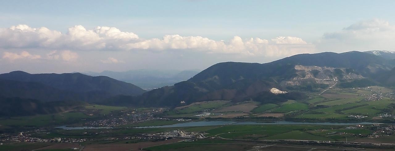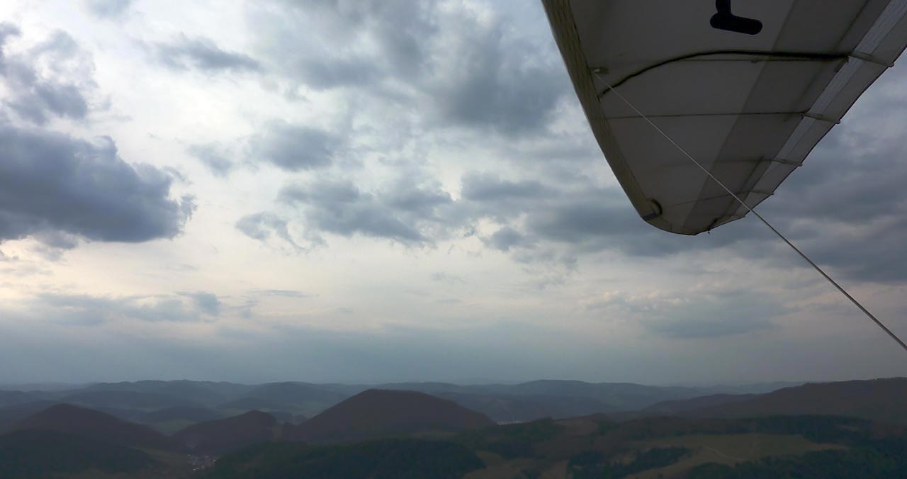 Vane poměrně silný a turbulentní vítr. Na startu jsem sám a tak se budu snažit přistát v sedle, kam jsem si ještě stačil svézt auto.