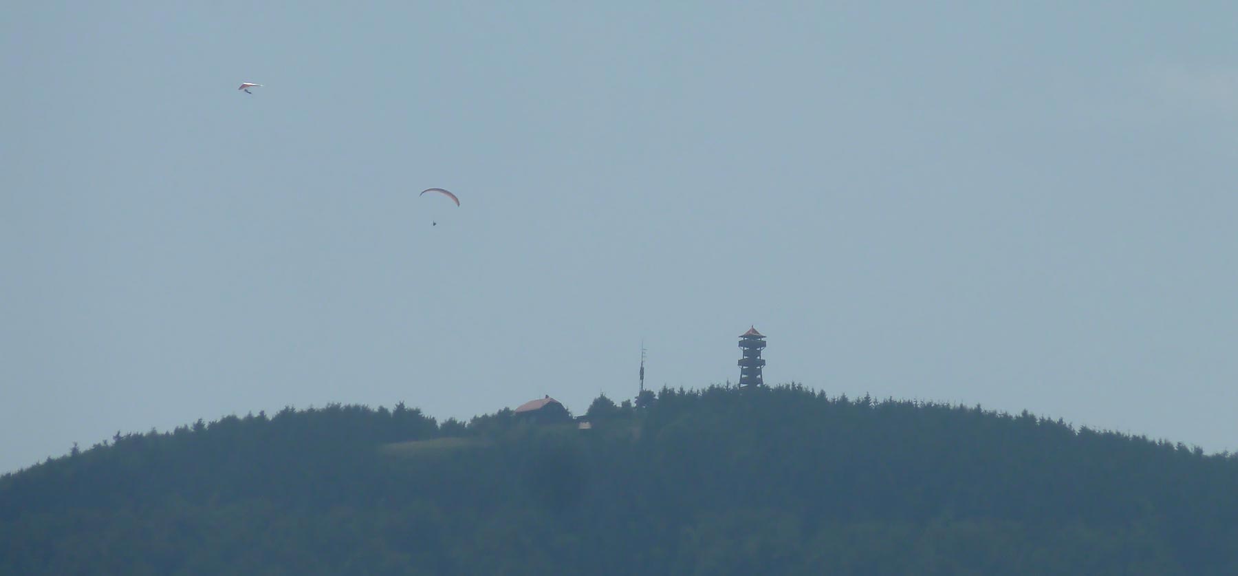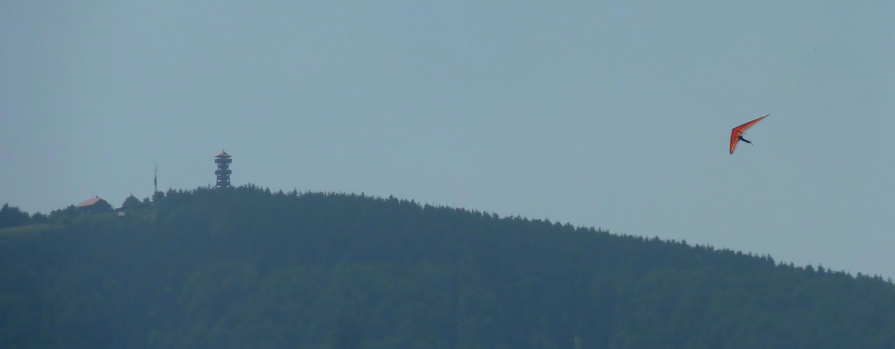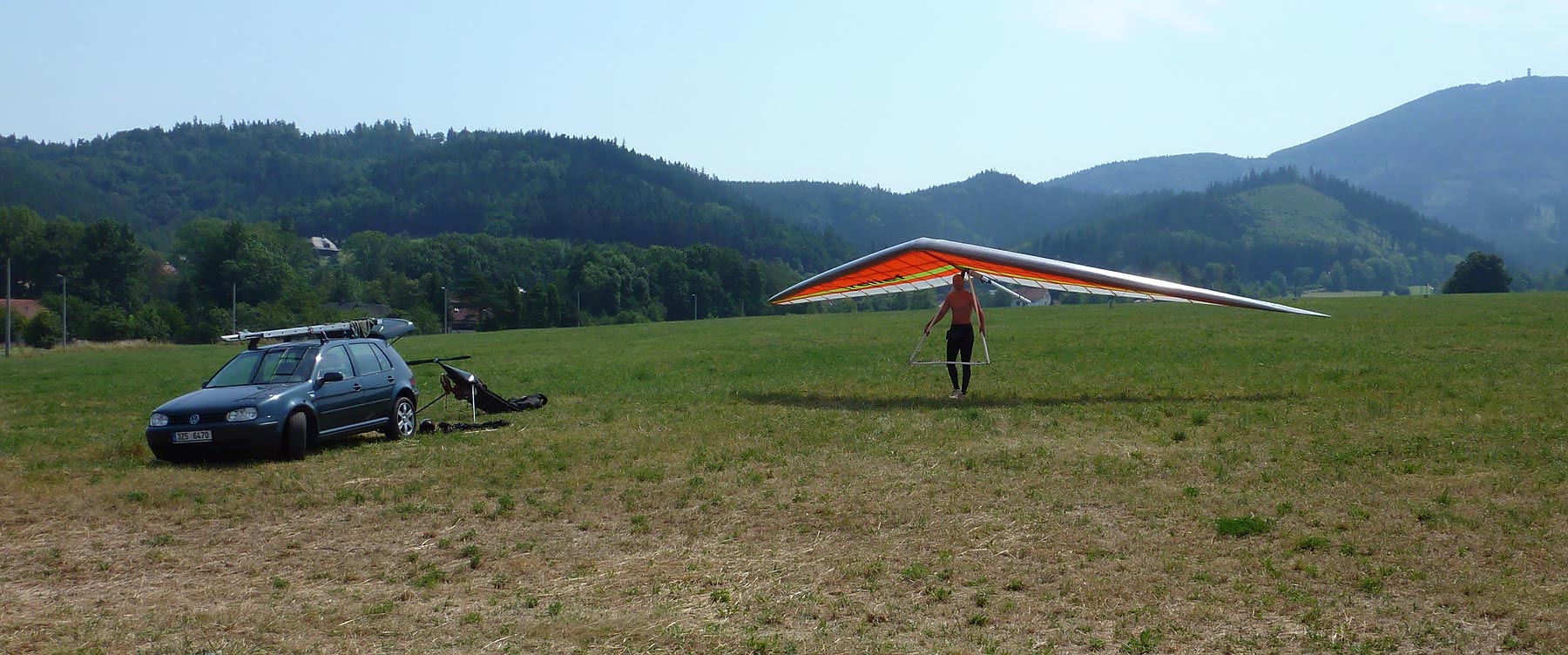 V neděli dopoledne se dovídám, že Michal dorazil na vhodné místo pod Javorníkem a že tam hodlá odstartovat. Když se blížím autem, vidím ho nade mne nalétávat. Přesně mi ze vzduchu ukazuje kam mám jet, a já jen žasnu jak dobře lze komunikovat z rogala ve vzduchu s řidičem v autě na silnici…