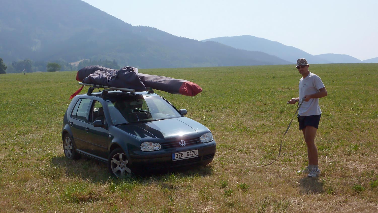 Michal našel stoupání a krouží s vypnutým motorem. Já si dělám pohodlí v zadní části svého kombi a s nachystaným aparátem čekám na jeho přílet.