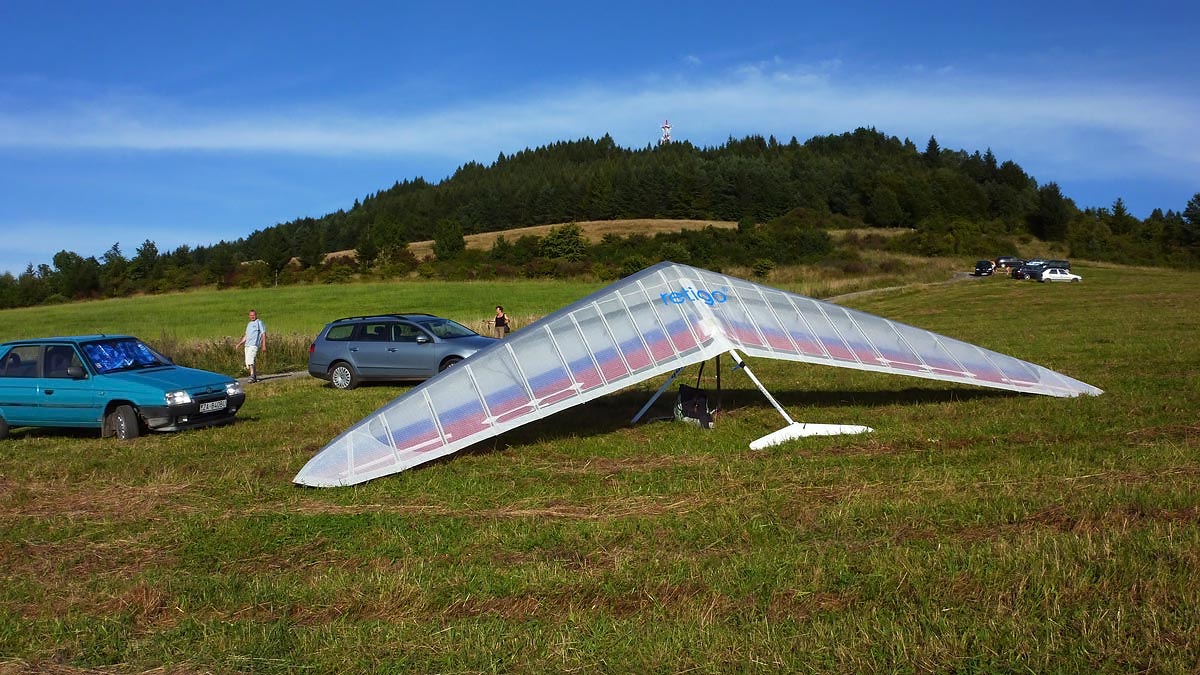 , vyrážím po 12. hodině na Straník. Při stavění křídla stačím jen všechny pozdravit, raději spěchám a startuji z rogalistů jako první.