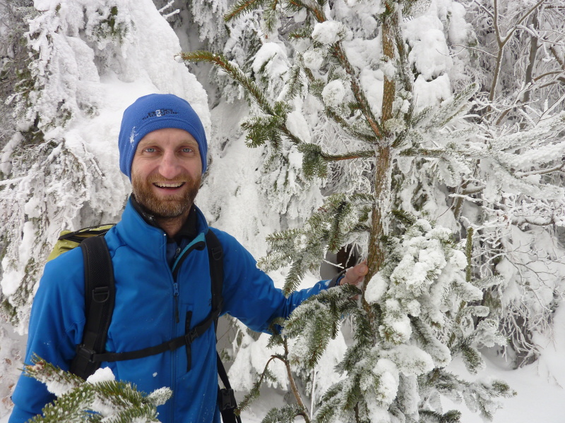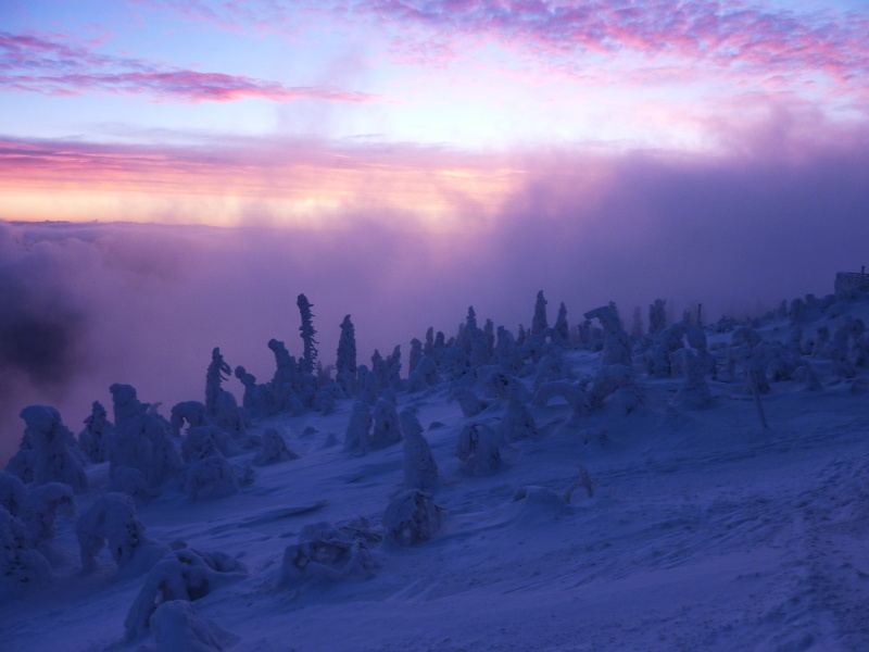 Vrchol byl v noci bičován 20 m/s větrem a mrazem kolem -15° C. Uznale jsme pozorovali účastníky 24h závodu ve výstupu na Lysou horu, kteří v těchto nelehkých podmínkách určitě bojovali i sami se sebou. Hlavy jsme složili v nově znovu otevřené chatě Emil Zátopek bývalá Válcovenská chata.