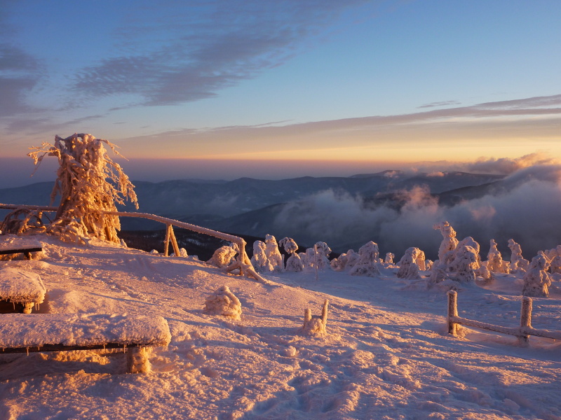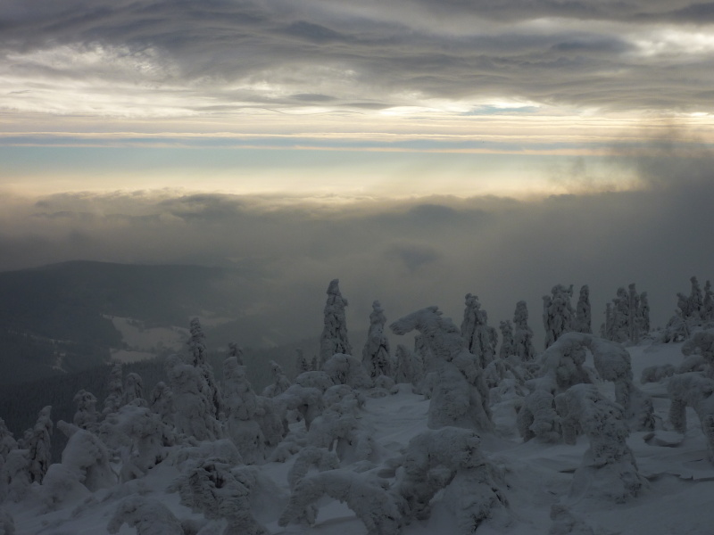 Těm, kteří si přivstali, ačkoli byl vrchol chvílemi v mraku, Lysá věnovala toliko nádherné výhledy do kraje zalitého mraky. Nemohl jsem se ubránit silné chuti si skočit a proletět… už se těším až přijde čas a proletím se nad touto krásou, budu hledat, které žebro mě podrží ještě chvíli ve vzduchu, přemýšlet nad další strategií letu, pozorovat turisty, krajinu a mraky, všemi smysly jinde, vytržen z lidem přirozeného prostředí tam, kde vládnou okřídlení kamarádi…