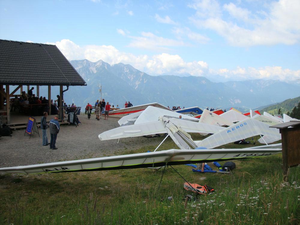 V pátek dopoledne se chvíli věnujeme ladění přistání a pak vyrážíme na Emberger Alm (převýšení 1100m). Někteří kluci se nezachytili, někteří raději utekli ze stoupání. V sobotu je první start pro kluky neúspěšný, ale na druhém si před příchodem srážek v klidném stoupání zalítali.