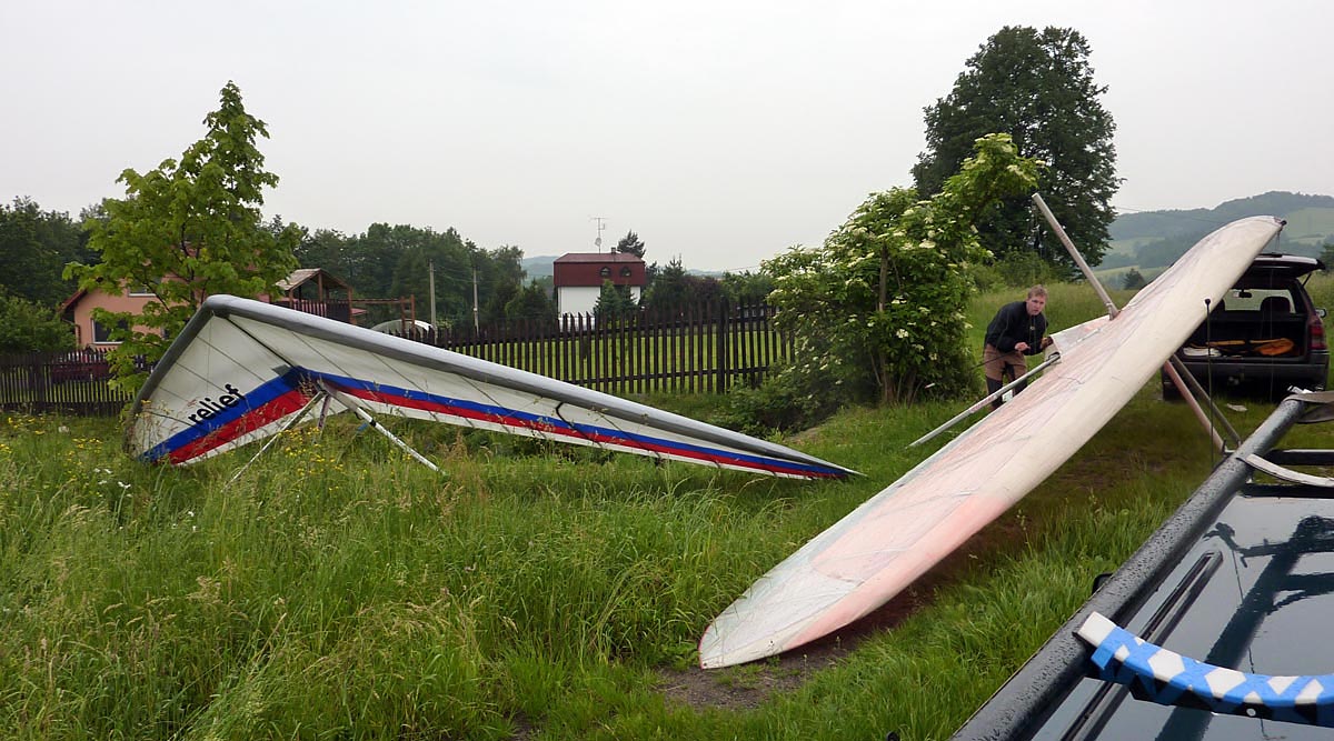 Létáme necelé dvě hodiny a nakonec se nám nedaří křídla vysušit za letu (začíná znovu pršet) a přistáváme oba s mokrými křídly, navíc do trávy víc než 150cm vysoké.