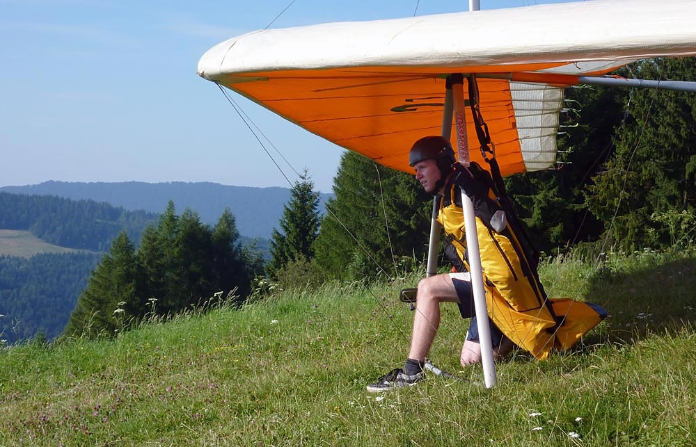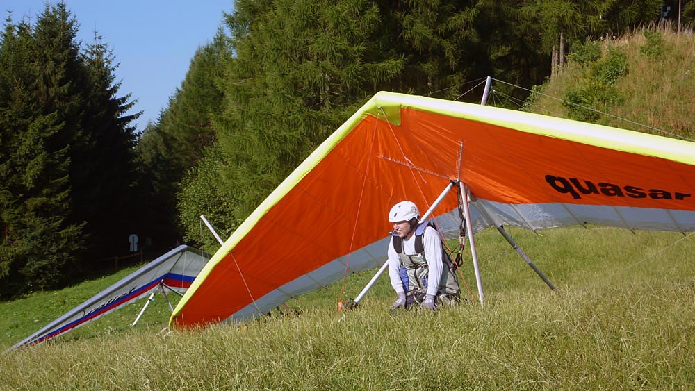 Na Straníku je nás celkem 6 rogalistů a také několik padáčkářů. Přesně podle předpovědi fouká slabý proměnlivý vítr a dá se startovat do termických závanů. Startuji s Pavlovým Quasarem z rogalistů první, vyprovokován kroužícím dravcem. Nacházím slabé, ale využitelné stoupání a po dostředění vytáčím základnu necelých 1900.