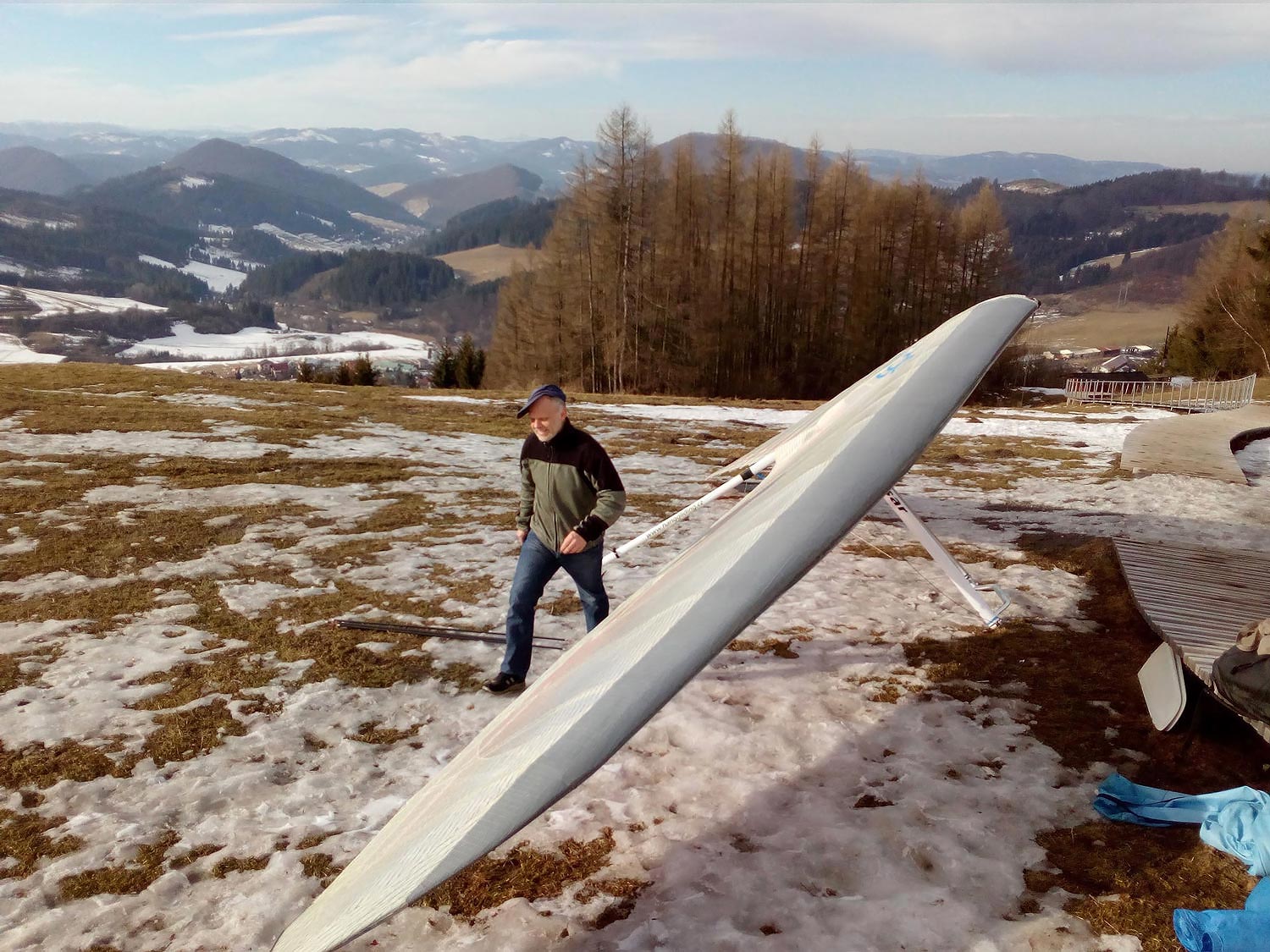 Vítr na startu vypadá docela letově, tak se pouštím do sestavení křídla. Podle hučení stožáru nahoře ale slyším, že to výrazně sílí. Když pak stojím s křídlem na startu, uvažuji o sbalení a snesení k autu….