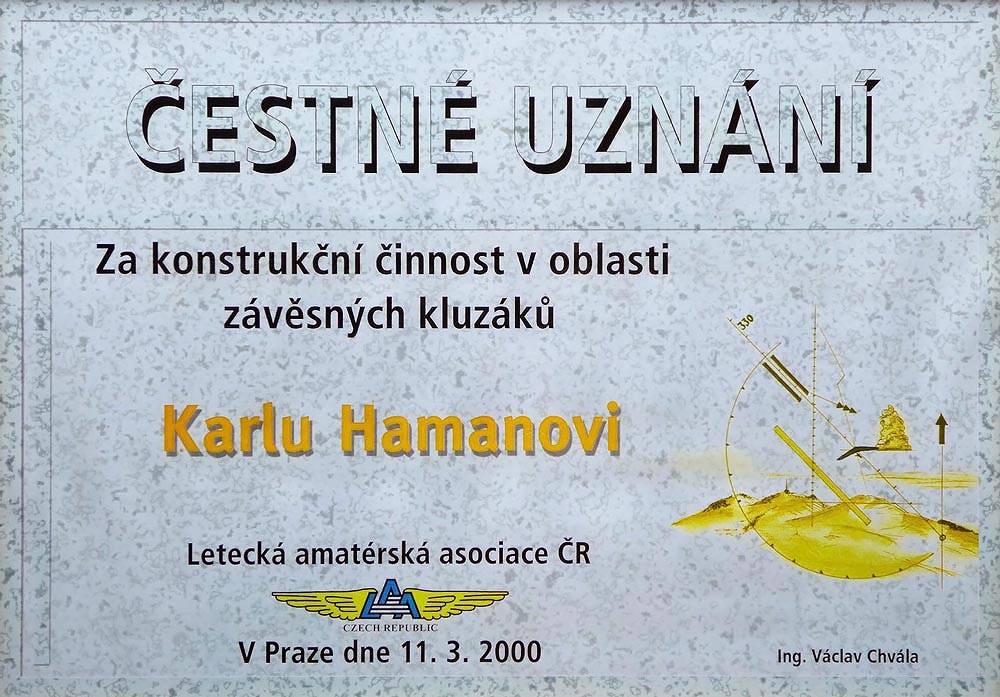 Čestné uznání od hlavního technika LAA, předávané v pražské Lucerně v roce 2000: