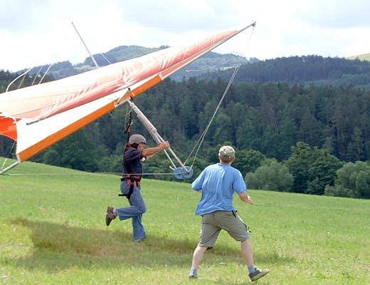 Láďa má přece jen jeden výcvikový den navíc a tak již dostatečně zvládl let vleže na to, aby mohl příště letět z většího kopce.