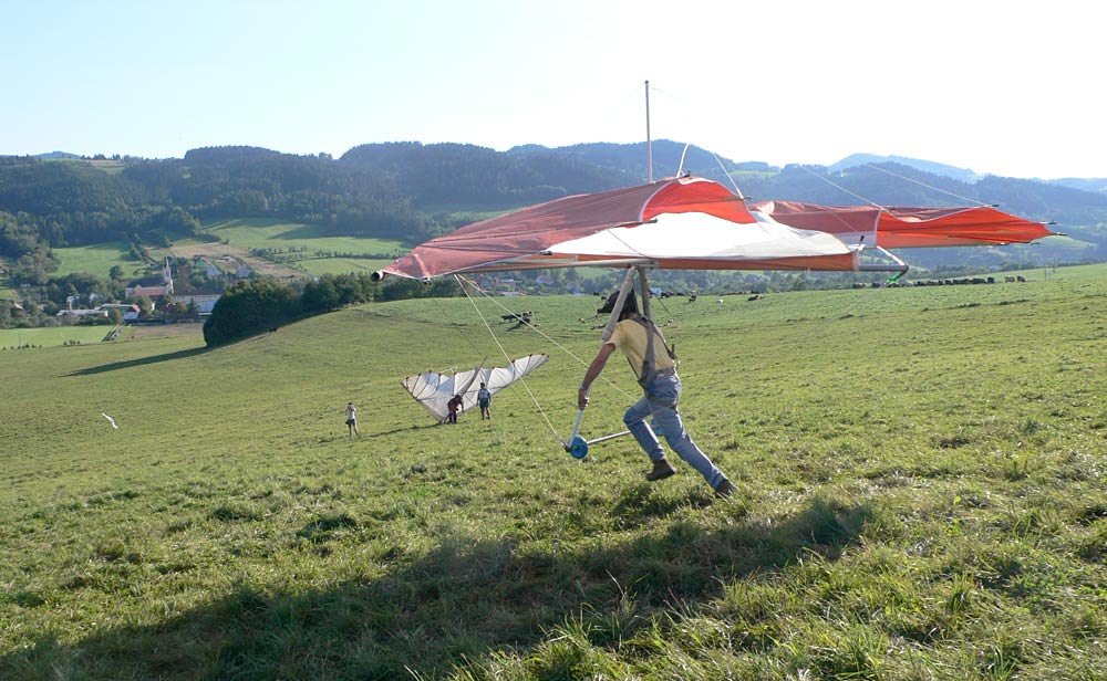 Po návratu na kopec jsou podmínky úplně předpisové a navzdory těžkým žaludkům umožní všem dlouhé lety. Jakmile se odlétá jedno kolo, vítr se opět otáčí, tentokrát přesně dozad. Rozhodujeme se pro ještě jeden přesun na JV startovištěm, ale po příjezdu to zas fouká jinak, tak dnešní den ukončujeme. I přes mírně laškující počasí se podařilo odlétat v podstatě celou látku základního kurzu a myslím, že jej můžeme označit za povedený.