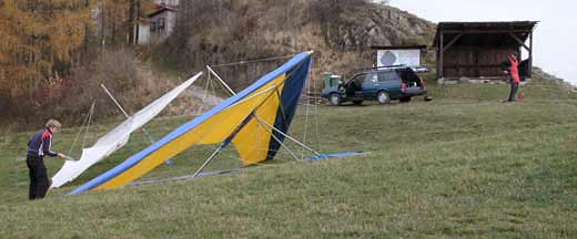 Po ránu se scházíme v témeř plném počtu na Vidči. Podle různých předpovědí má dnes foukat od JV přes Z až po SV. Nám se zdá, že si vítr vybral severní směr a proto přecházíme na severní startoviště. Zde se opakuje nácvik startu a přístání - víc tento terén nedovolil, protože vítr si fouká chvilku ze západu, chvilku ze severu a chvilku třeba vůbec:-(. Díky prodlužujícím se pauzám mezi jednotlivými pokusy se nakonec rozhodujeme pro přesun zpět na hlavní Vidče. Po chvilce vyčkávání na příhodne podmínky se oběd jeví jako lepší varianta programu, protože počasí si opravdu dělá co chce.