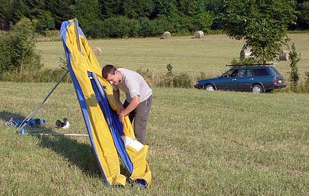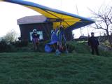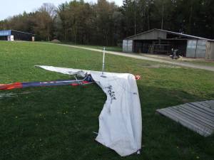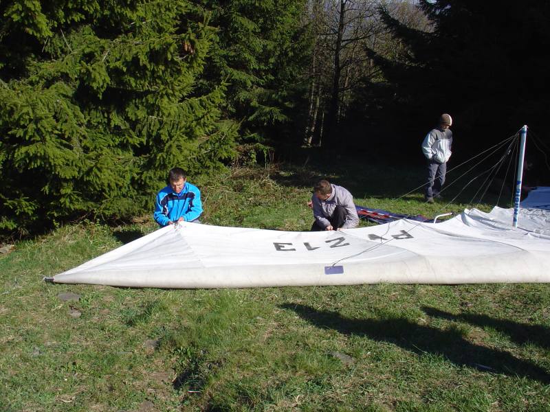 Další pokračování následovalo v neděli 28. 4., kdy jsem rogalo transportoval na Bečvu. Počasí nevypadalo nikterak lákavě , občas i pršelo a tak jsme se napřed vrhli na administrativní věci. Po několika dobrých kafíčkách, skvělém obědě v restauraci, přestalo alespoň mrholit a my jsme mohli zahájit kontrolu křídla. Ta probíhala hladce, pouze občas někdo utrousil poznámky typu: A na tomhle mám letět? Vždyť on je to v podstatě hrozný krám. Vždyť to nemá ani stabilizátor, měnitelný profil, změnu vektoru tahu a další samozřejmé vychytávky moderních křídel. Nakonec se začala zvedat oblačnost a reálně hrozilo, že křídlo půjde i do vzduchu.