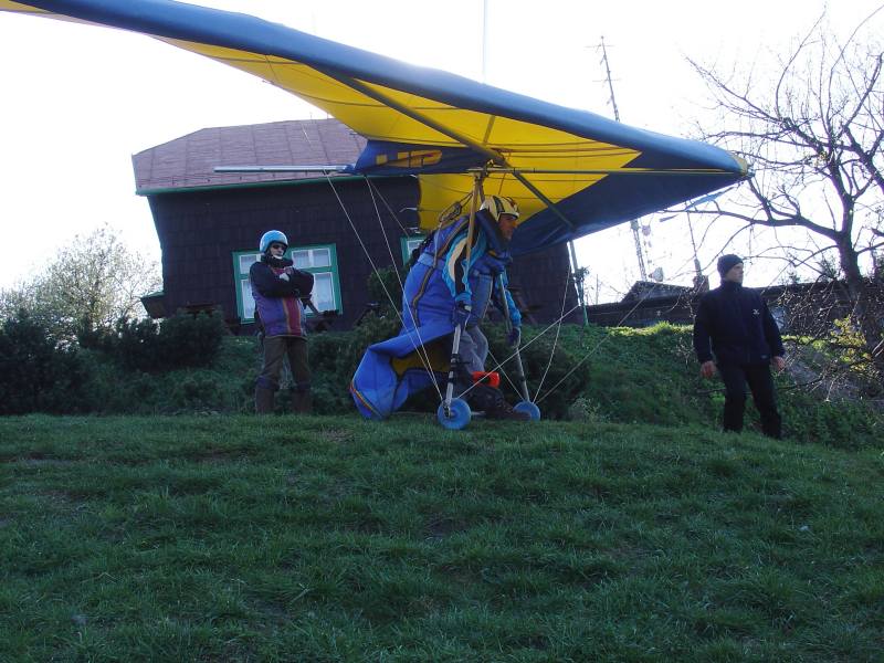 Stavíme křídla a pozorujeme bojujícího Martina, nakonec nám mizí někde za kopcem a později se dovídáme, že si udělal malý přeletík do Mořkova. Kolem 16 hod jsme ready for start. Jdu jako první. Trochu s respektem se přemeřuji smrčky před startem. Po chvíli vyčkávání na správný vítr mi “řídící vež” povoluje vzlet a tak se pořádně rozbíhám a už letím. Smrčky mijím v bezpečné výšce a na rozdíl od minule odmítám jejich hebké špičky, které lákají k baječnému přistání
