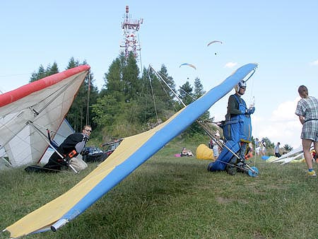 V pondělí jsme sbírali zahradní, pracovní, domácí a já nevím jaké ještě body, abychom mohly v úterý znovu vyrazit na kopec a naše skvělé ženy neměly příliš důvodů protestovat. Kolem 14hod přijíždíme na Bečvu, zdvořile odmítáme pozvání na kafe s tím, že si jej dáme až nahoře na Javorníku a nakládáme křídla. Přijíždí i Lukáš, ale protestuje proti naložení svého rogala s tím, že se dneska nějak necítí a bude raději jen jako divák. Napřed jedeme zkontrolovat přistávačku, kde nostalgicky vzpomínáme na obrovskou plochu pod Straníkem. Po příjezdu nahoru obhlížíme startoviště a stavíme křídla. Fouká svižný vítr přesně na start. Zahajujeme čekání na klidnější vítr. Nicméně ten nejeví známky utišení a tak se chystáme na start.
